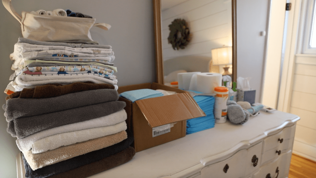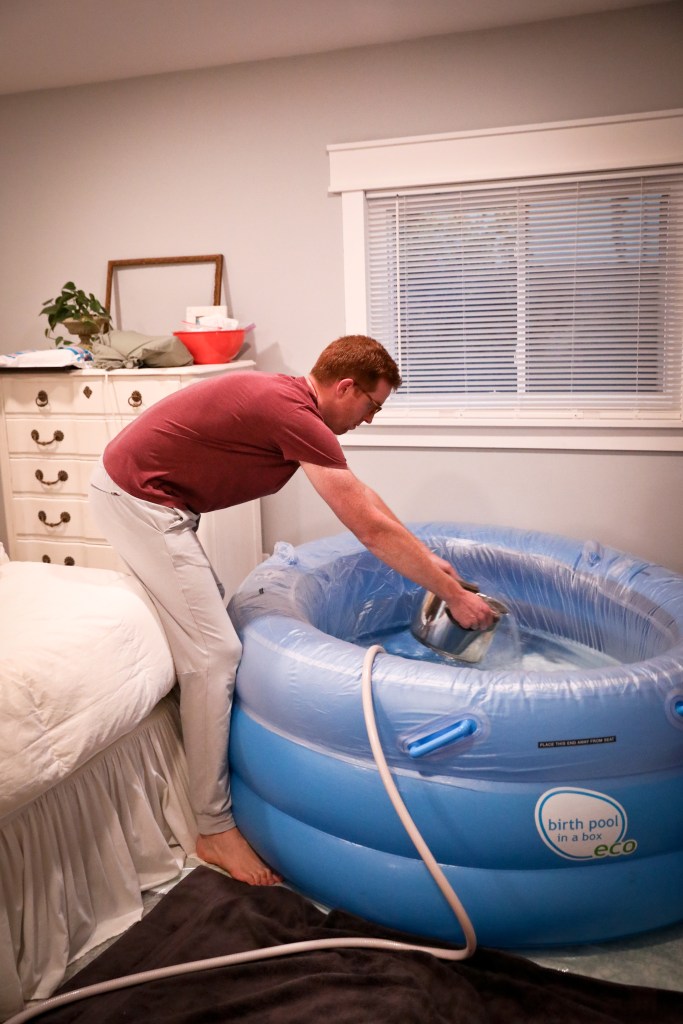 Rest?! Ha! William and I both popped out of bed to begin transforming our room. While I had everything somewhat prepped, there were obviously a few more things we had planned on doing in the final weeks. By this time, Henry was up and he was excited to “help” us get ready for baby brother. William moved my dresser out of way and blew up the birthing tub. And I got the supplies all set out and organized, while mentally and emotionally trying to shift gears. Is this really happening today?!