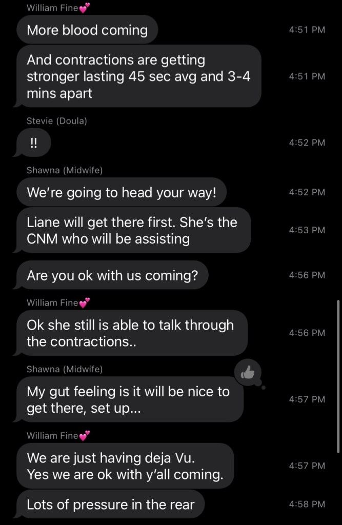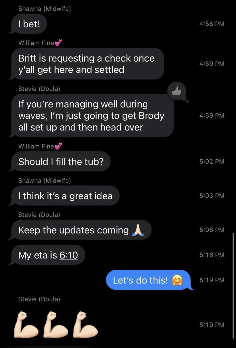 By 5:30 AM, I reached out to our doula, Stevie, to let her know what my morning had consisted of. “I have had a minimum of 3 contractions an hour that are accompanied by pretty strong lower back cramping and pressure in my bottom all night. They feel spread out (and are shorter than a minute) to where I’m assuming it’s not real labor, but it definitely feels different (and harder to sleep through) than the Braxton Hicks I’ve been having the last couple of weeks.” She suggested I keep trying to rest and we should check back in an hour or so to see if anything was longer/stronger/closer.