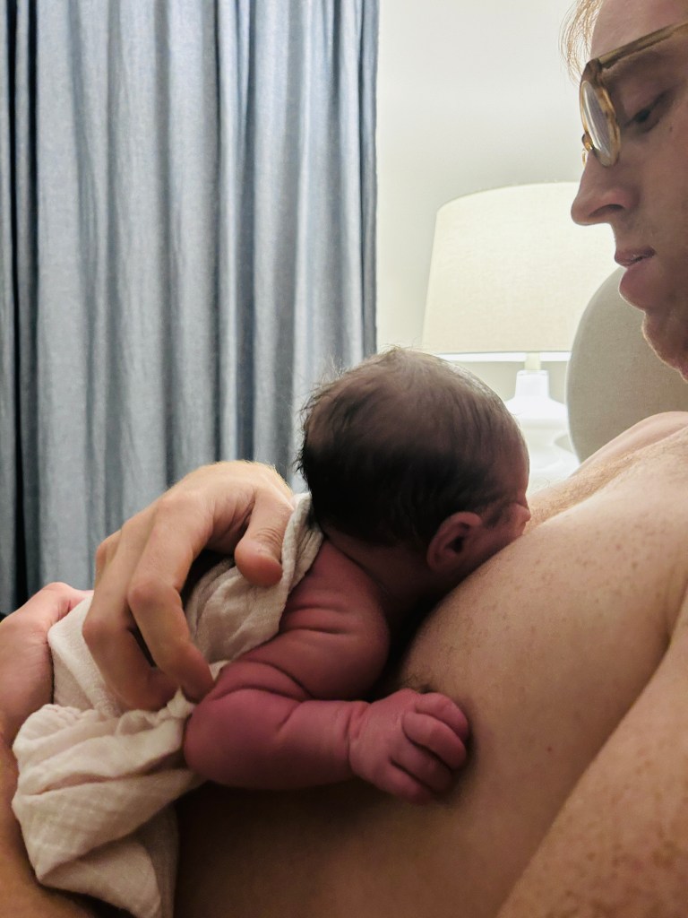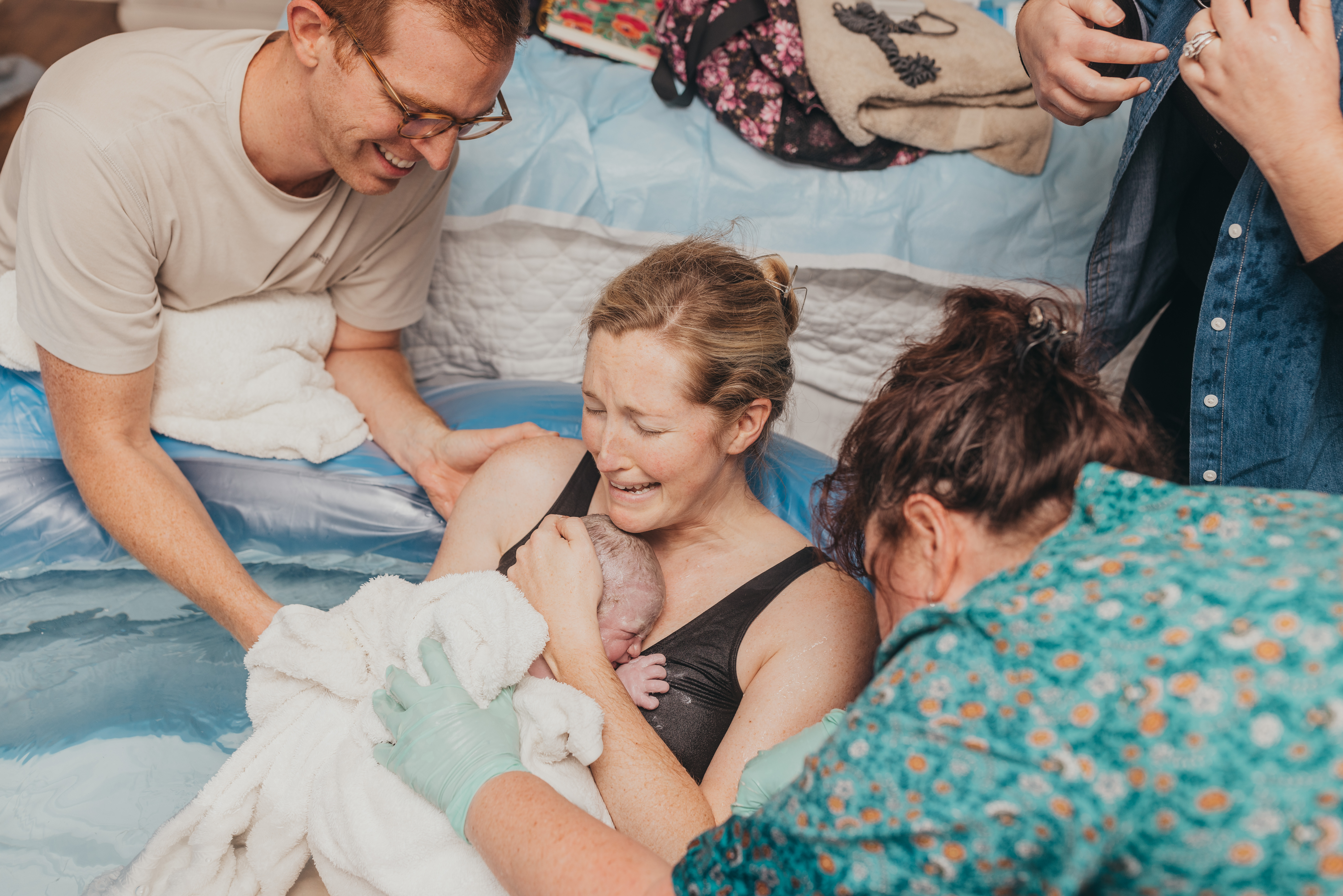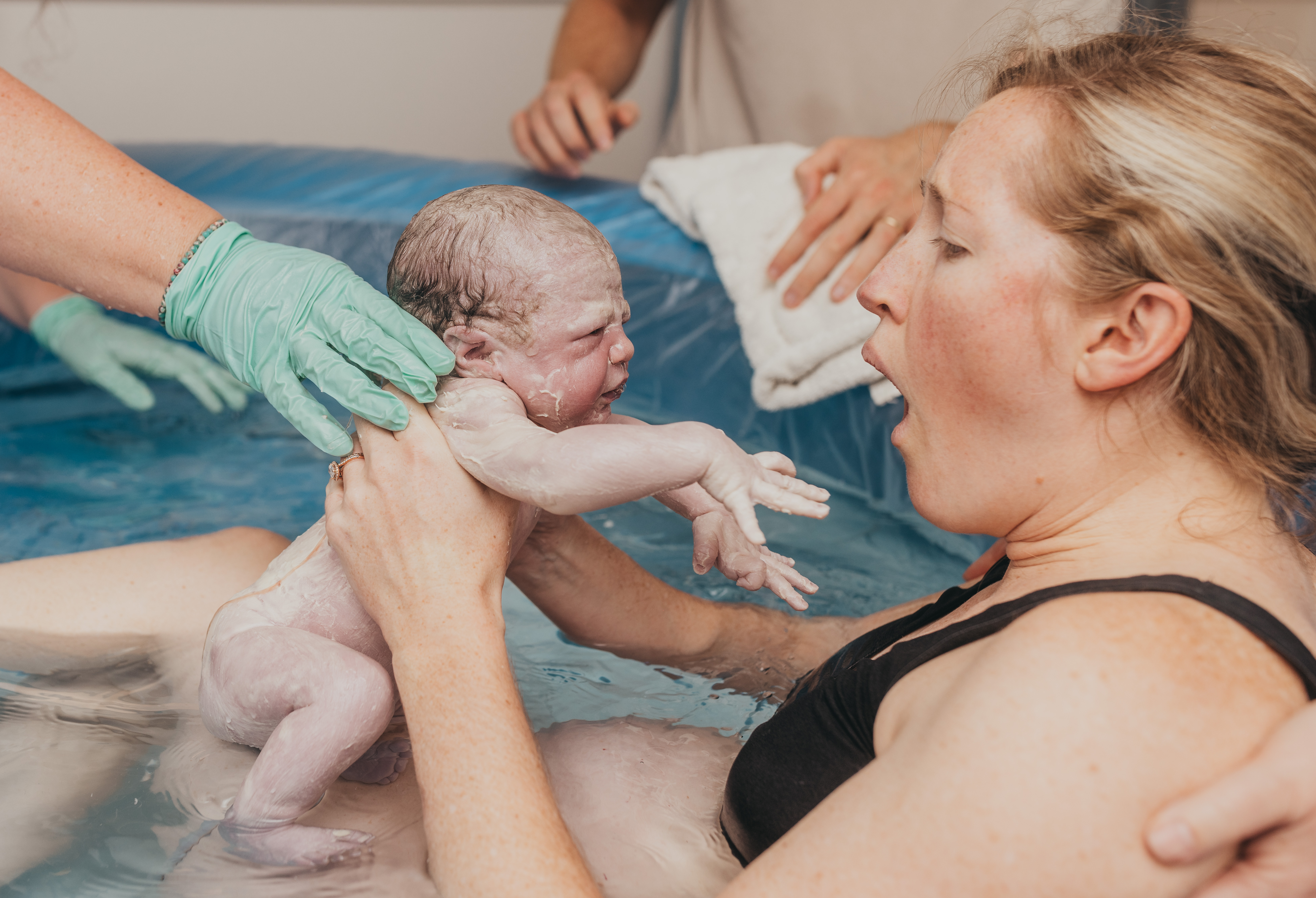 The whole room filled with emotion as Tracy passed her up under my legs and I finally got to fall back into the water, with my little girl melting into my chest. Pure bliss. I’m of course ugly crying and embracing my wide eyed girl. Her little face is totally overwhelming us. Everyone else is taking her in as I finally look up and say “welllllll, that wasn’t ideal“, which makes everyone laugh.