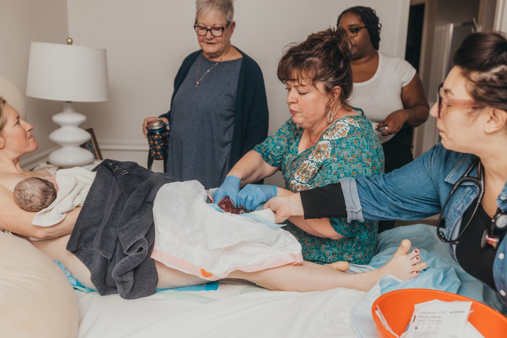Moments later, in comes Debbie too, grinning ear to ear — she finally made it! And all we could do was chuckle about everything that had transpired since she first came groggily through our door the night before. All 4 midwives now got to assist in the placenta being born, as Georgia peacefully nursed, and (even though the porch light was off) trick or treaters unfortunately continued to knock on the door (and my mom passed out candy) one wall over.