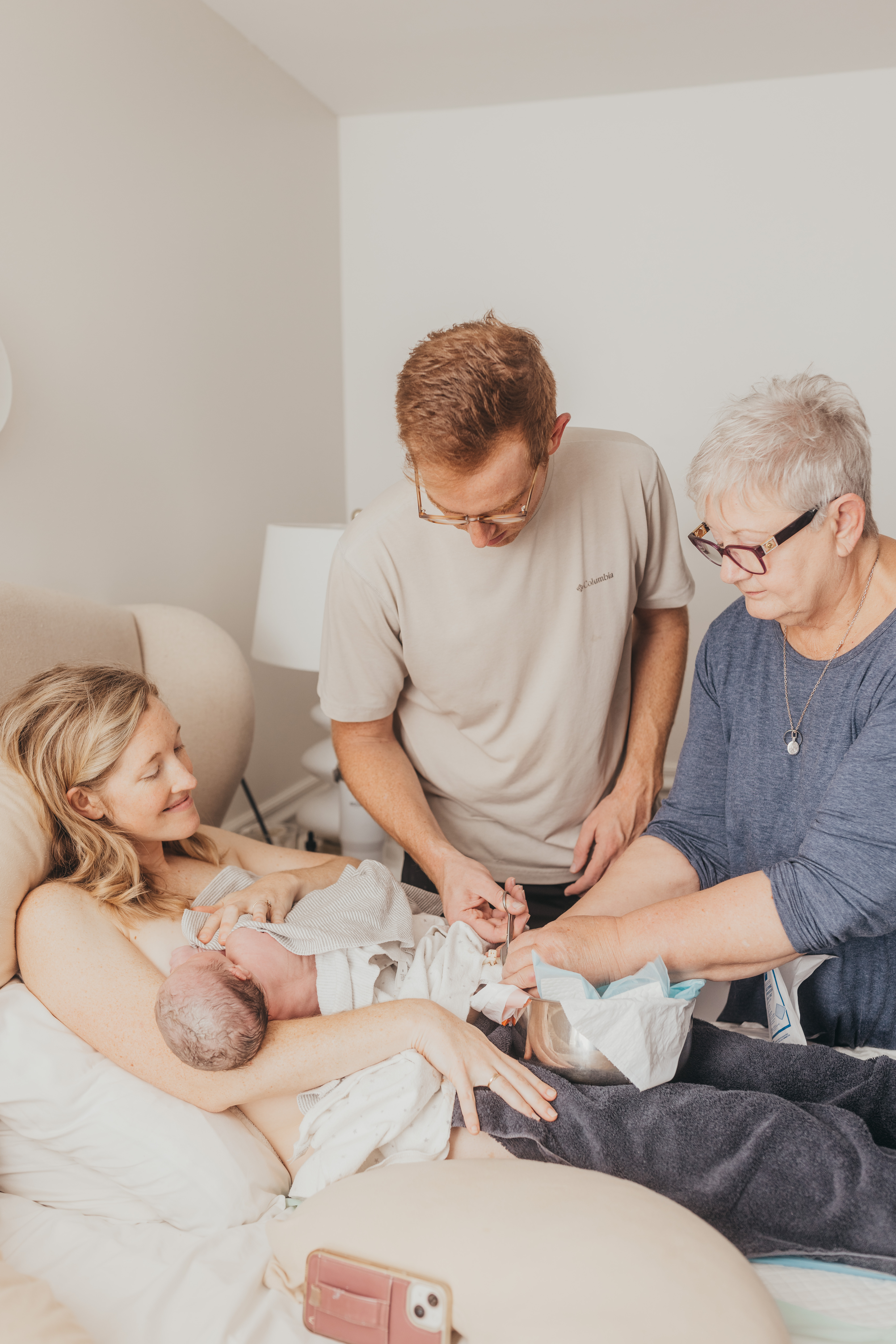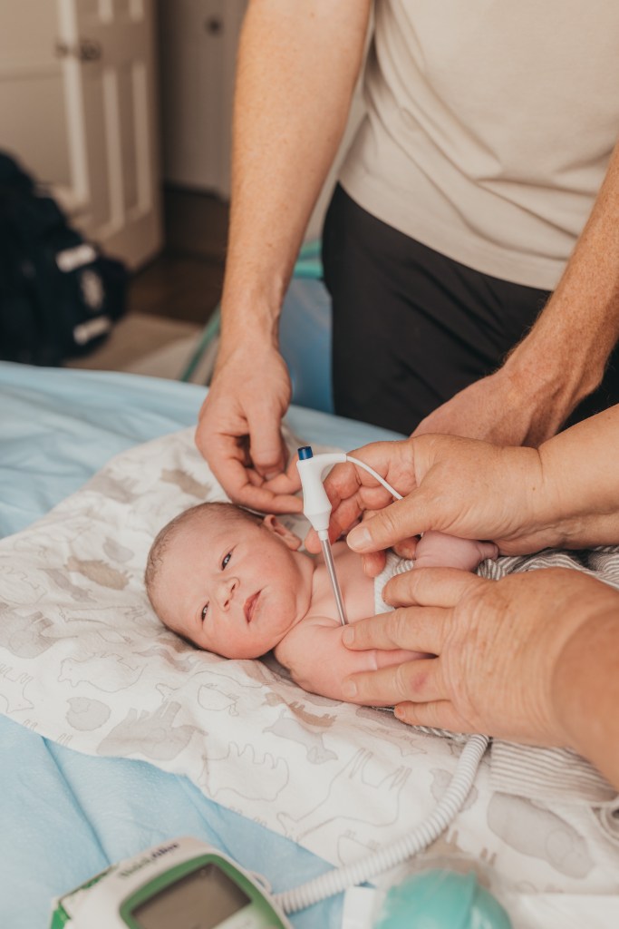 After an hour of skin to skin, William got to cut her completely dried up cord. Then we all gathered around the bed for her newborn screening, one of my favorite, most intimate parts of homebirth.
